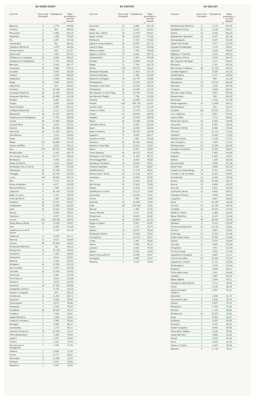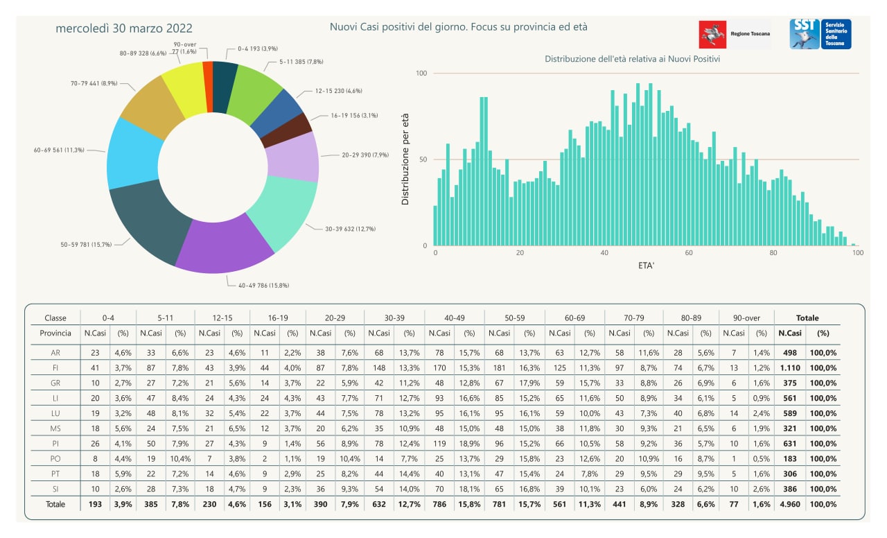 “I nuovi casi registrati in Toscana sono 4.960 su 32.144 test di cui 7.584 tamponi molecolari e 24.560 test rapidi. Il tasso dei nuovi positivi è 15,43% (63,4% sulle prime diagnosi).