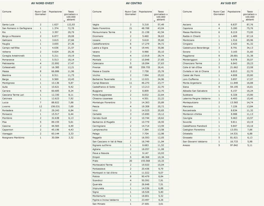 “I nuovi casi registrati in Toscana sono 418 su 17.876 test di cui 8.485 tamponi molecolari e 9.391 test rapidi. Il tasso dei nuovi positivi è 2,34% (7,3% sulle prime diagnosi).