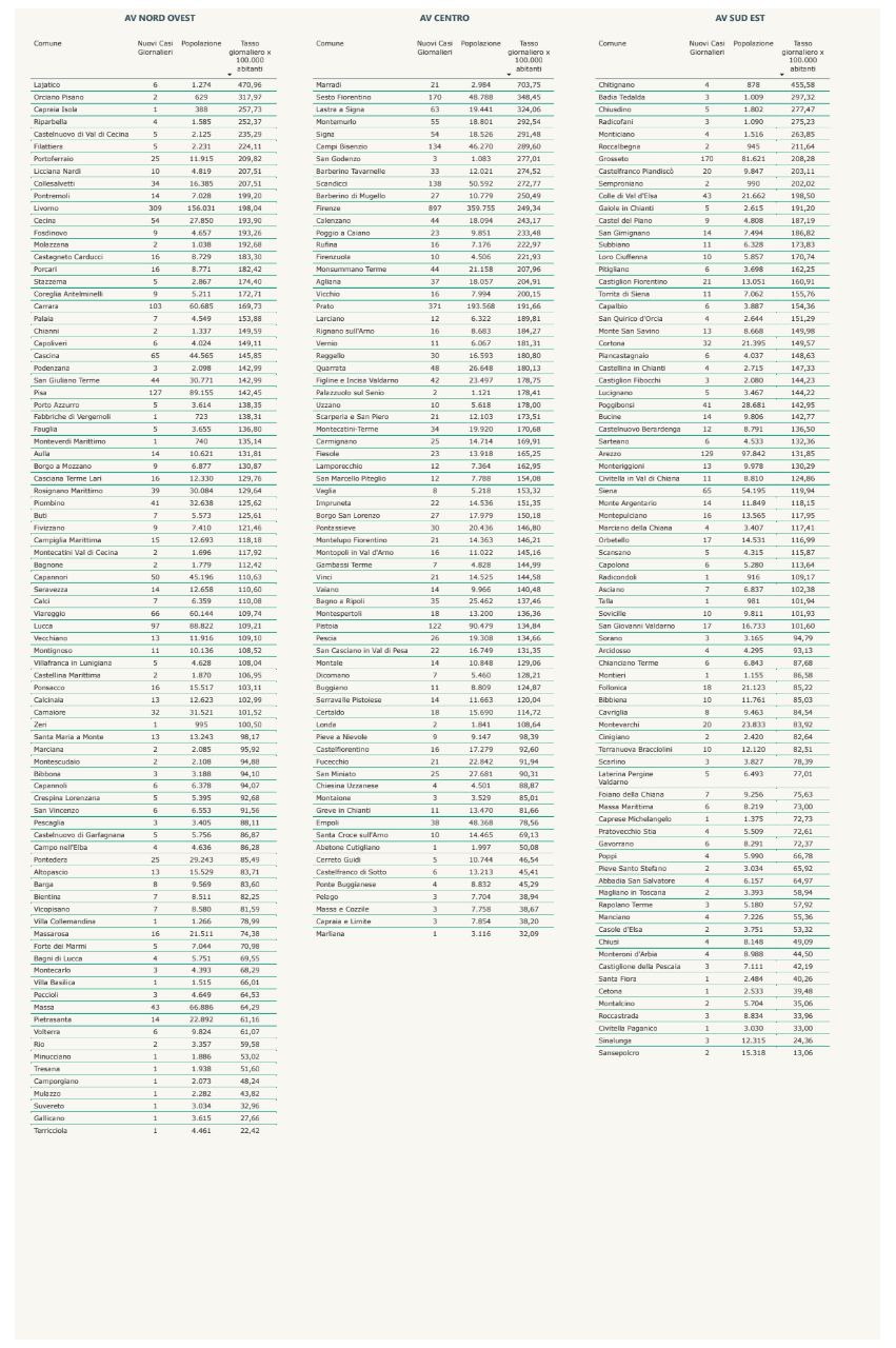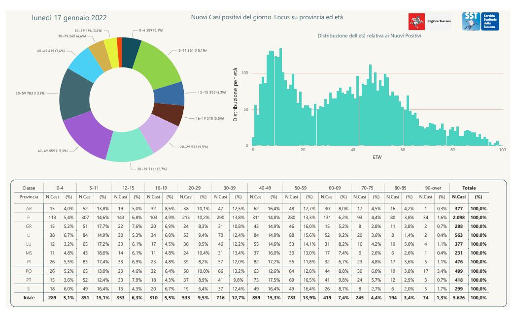 “I nuovi casi registrati in Toscana sono 5.626 su 31.774 test di cui 15.970 tamponi molecolari e 15.804 test rapidi. Il tasso dei nuovi positivi è 17,71% (67,9% sulle prime diagnosi).