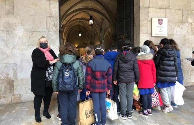 I bambini, prima di donare il materiale, si sono fermati sotto i loggiati del palazzo comunale per leggere all’assessore Poli le loro poesie e portare un messaggio di pace. La visita a Palazzo Gambacorti giunge a conclusione di una giornata dedicata alla riflessione sul tema della pace che ha coinvolto tutte le classi dalla scuola Zerboglio, i loro docenti e il personale ATA e che ha visto protagonisti i bambini nel leggere pensieri, poesie, realizzare disegni e partecipare a un momento di condivisione nel giardino della scuola, che si è concluso con il lancio di palloncini carichi di colore, messaggi e speranza.