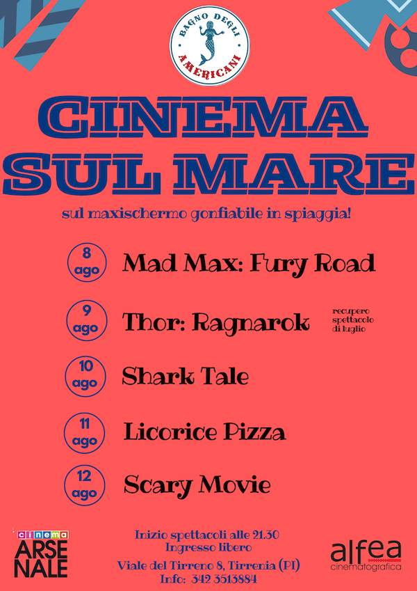 La rassegna “Cinema sul mare” si svolge in collaborazione con il Cinema Arsenale di Pisa e con Alfea Cinematografica.
