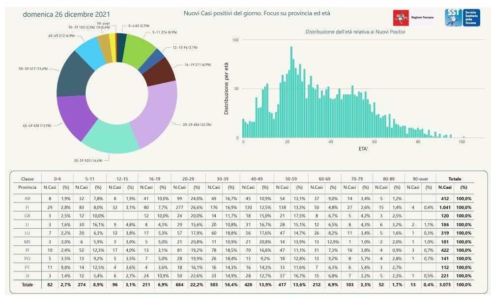 “I nuovi casi registrati in Toscana sono 3.075 su 15.616 test di cui 12.073 tamponi molecolari e 3.543 test rapidi. Il tasso dei nuovi positivi è 19,69% (44,7% sulle prime diagnosi).