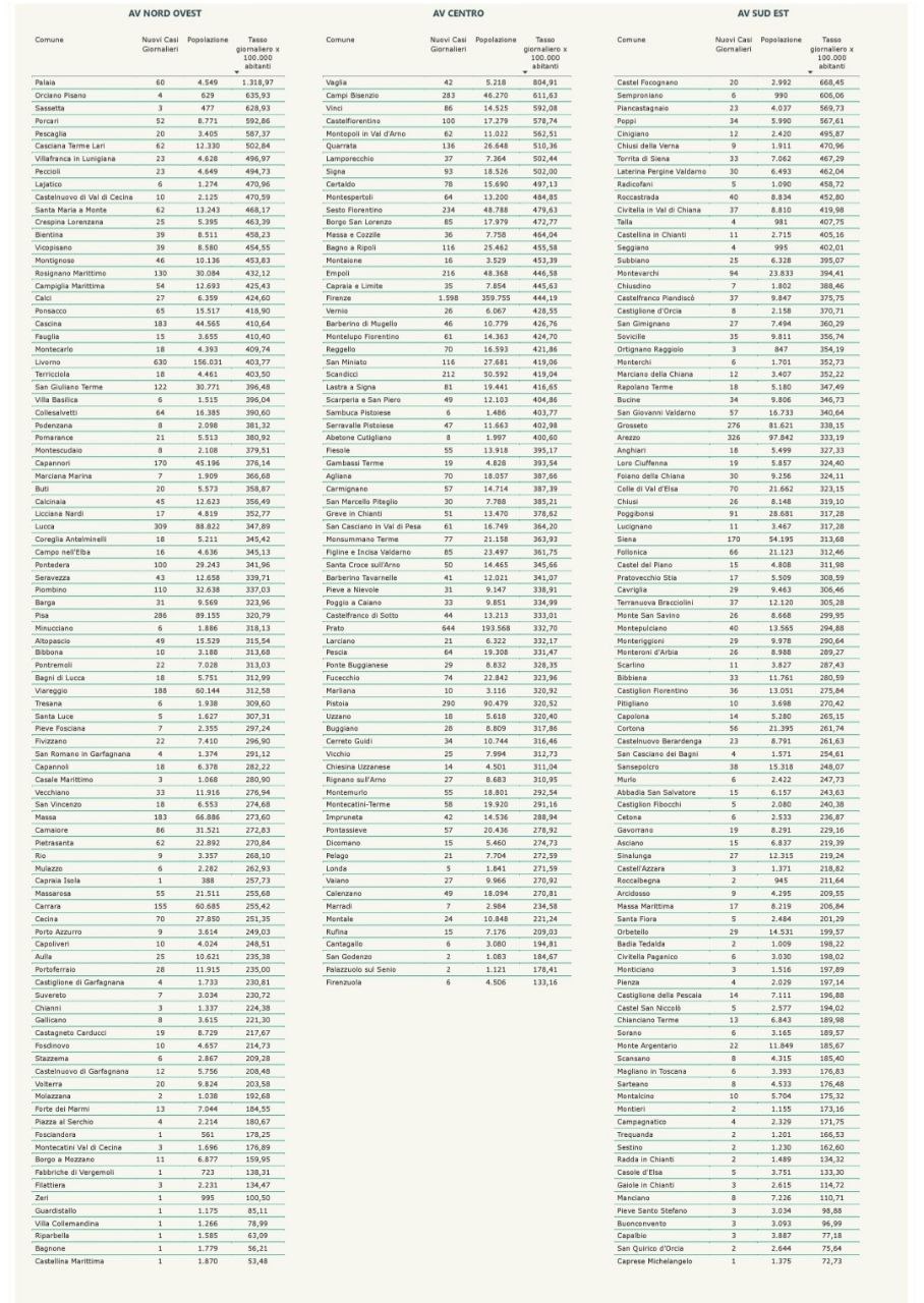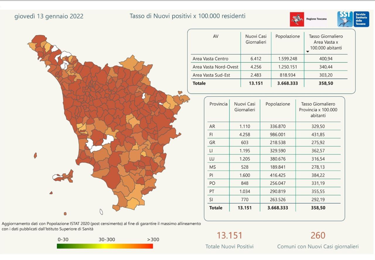 “I nuovi casi registrati in Toscana sono 13.151 su 77.388 test di cui 24.353 tamponi molecolari e 53.035 test rapidi. Il tasso dei nuovi positivi è 16,99% (69,3% sulle prime diagnosi).