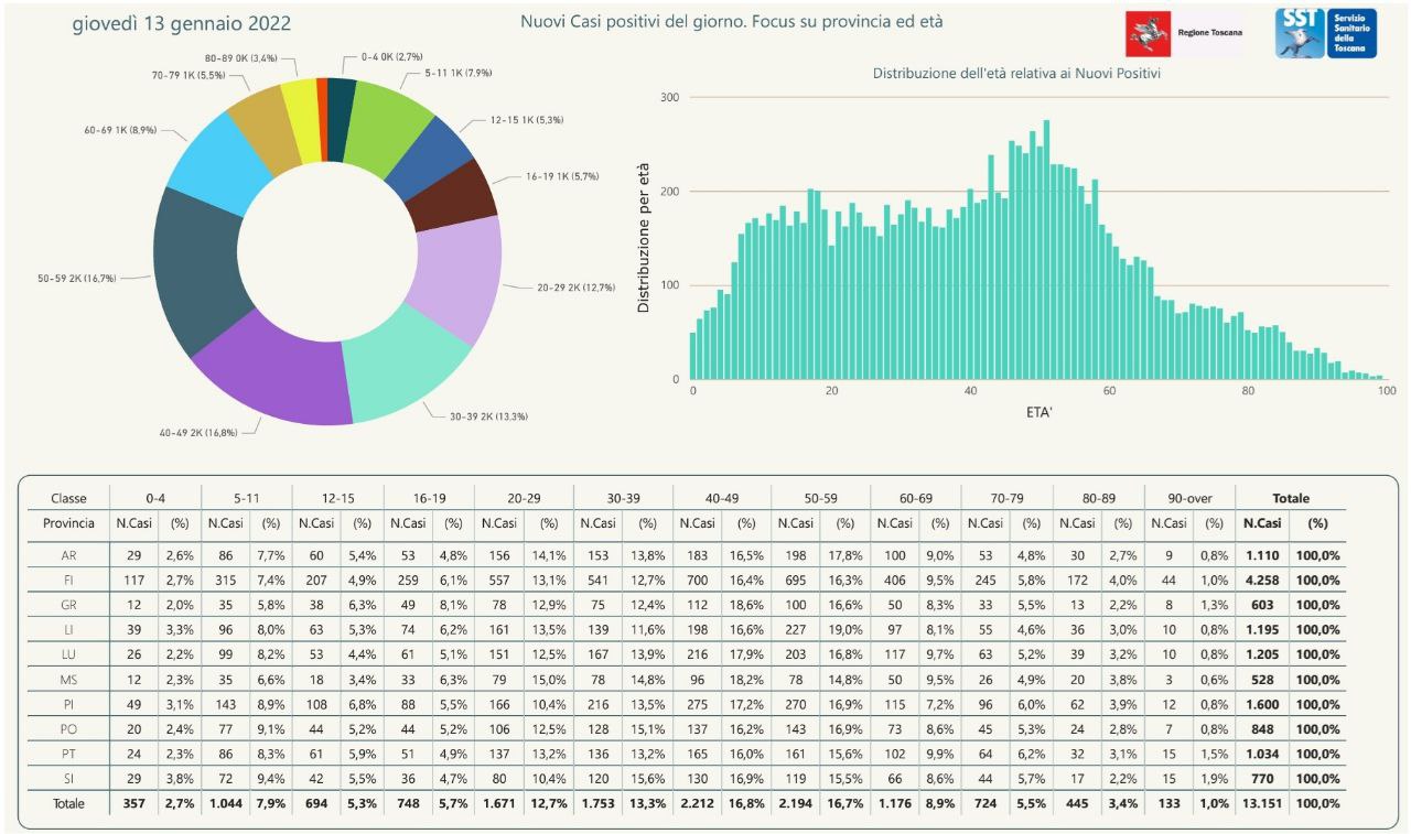 “I nuovi casi registrati in Toscana sono 13.151 su 77.388 test di cui 24.353 tamponi molecolari e 53.035 test rapidi. Il tasso dei nuovi positivi è 16,99% (69,3% sulle prime diagnosi).