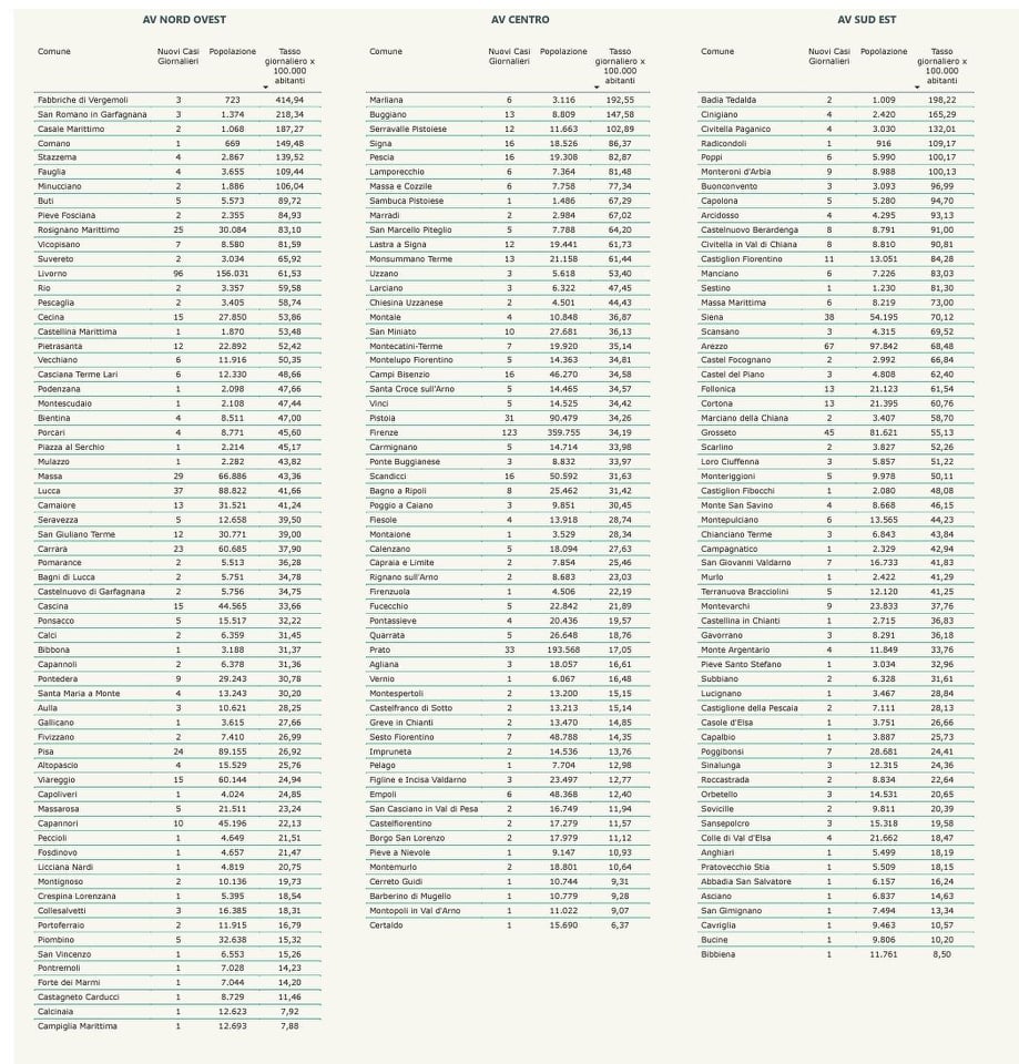 “I nuovi casi registrati in Toscana sono 1.282 su 37.624 test di cui 12.027 tamponi molecolari e 25.597 test rapidi. Il tasso dei nuovi positivi è 3,41% (11,3% sulle prime diagnosi).