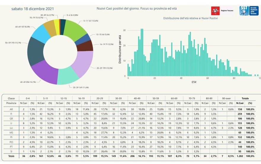 Pubblicati i dati di oggi, 18 dicembre, in Regione Toscana. Sono 1.282 i nuovi casi positivi in Toscana nelle ultime 24 ore. Sono 132 i nuovi casi in provincia di Pisa