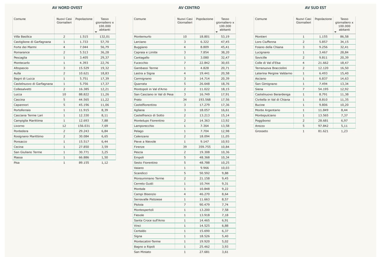 “I nuovi casi registrati in Toscana sono 279 su 17.516 test di cui 7.099 tamponi molecolari e 10.417 test rapidi. Il tasso dei nuovi positivi è 1,59% (5,4% sulle prime diagnosi).
