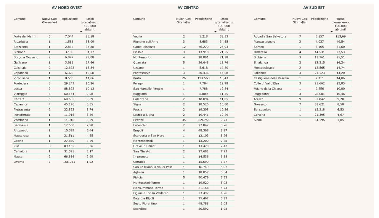 “I nuovi casi registrati in Toscana sono 243 su 10.190 test di cui 5.879 tamponi molecolari e 4.311 test rapidi. Il tasso dei nuovi positivi è 2,38% (5,7% sulle prime diagnosi).