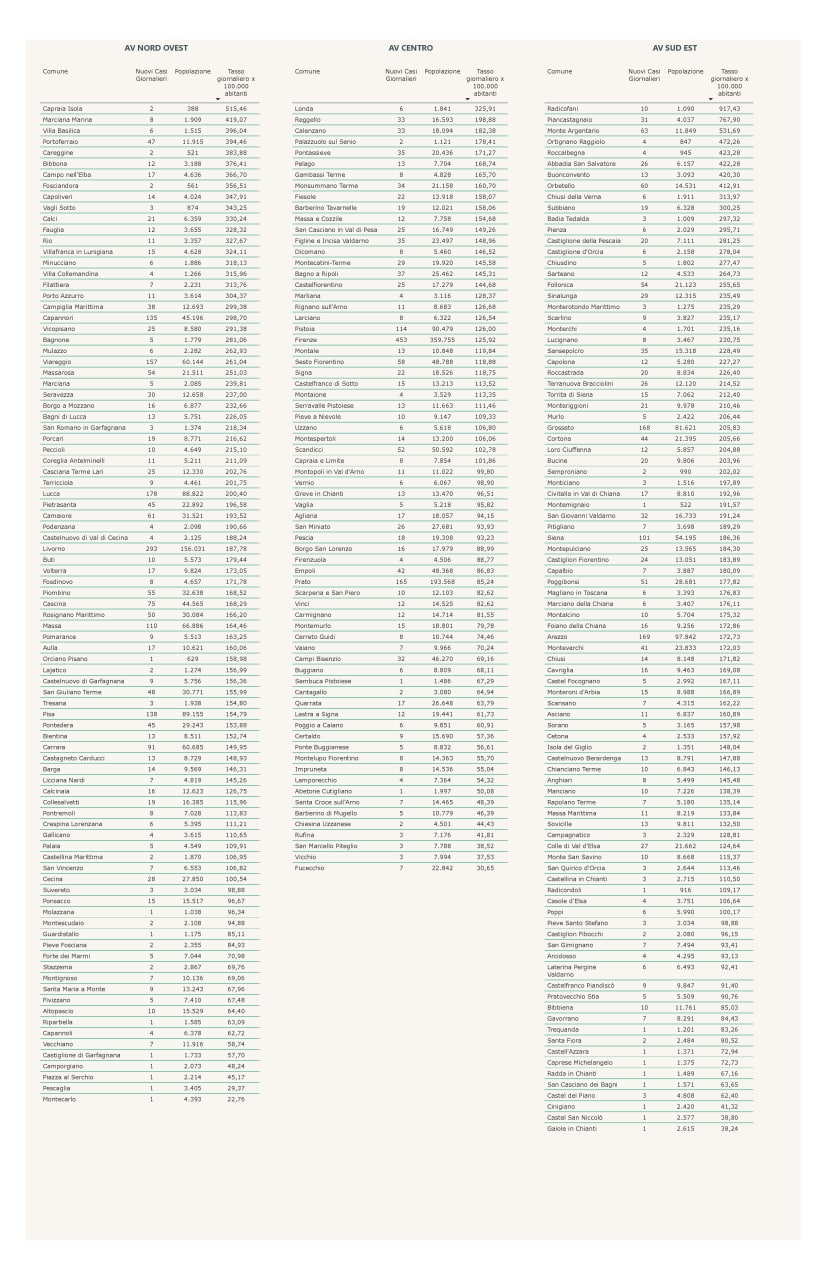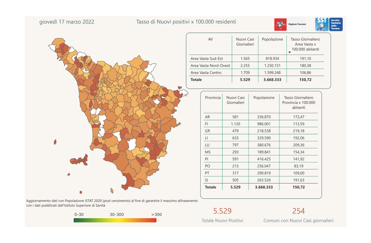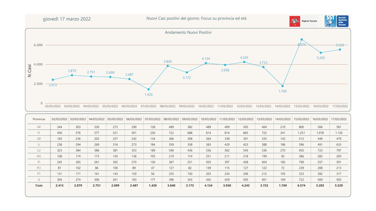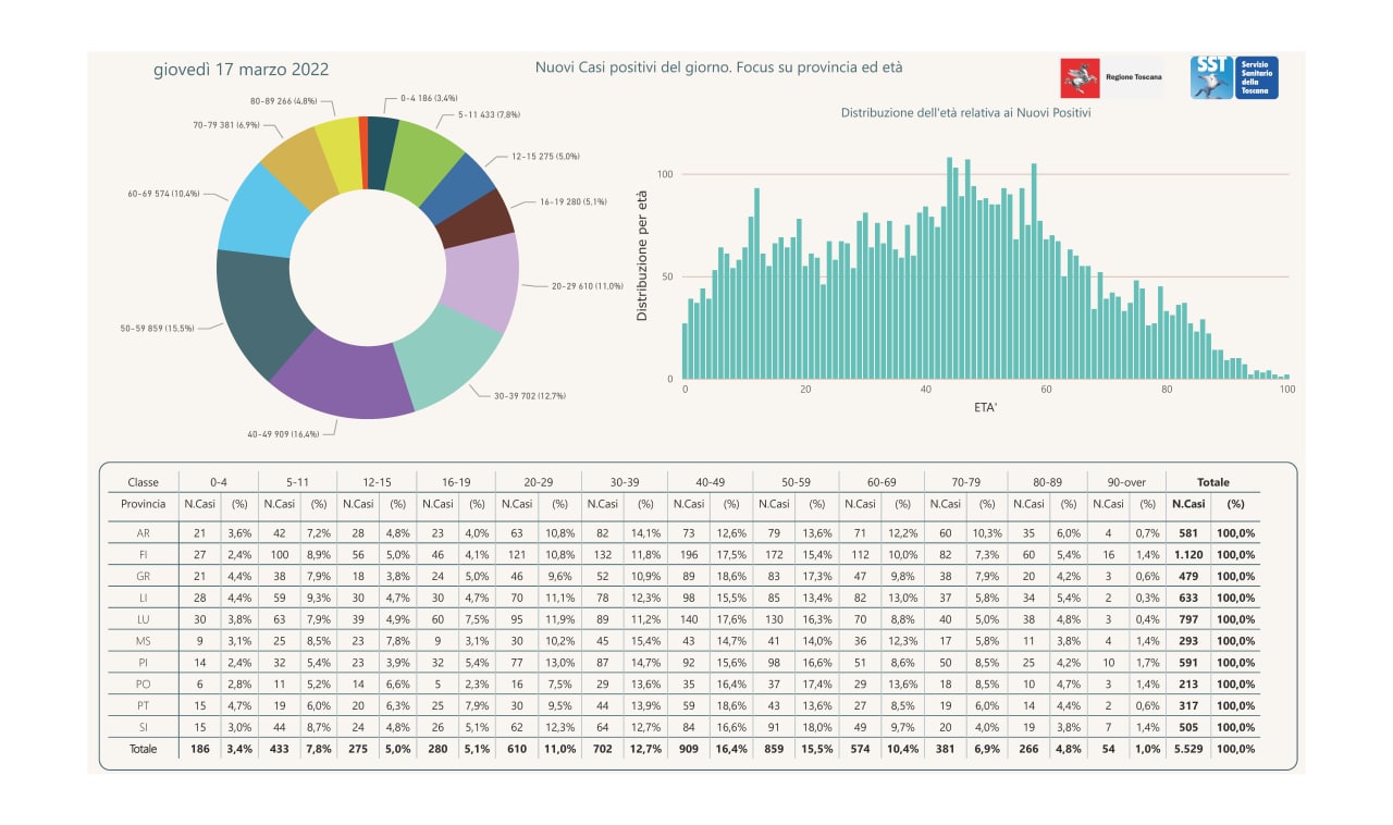 “I nuovi casi registrati in Toscana sono 5.529 su 34.238 test di cui 7.835 tamponi molecolari e 26.403 test rapidi. Il tasso dei nuovi positivi è 16,15% (61,8% sulle prime diagnosi).