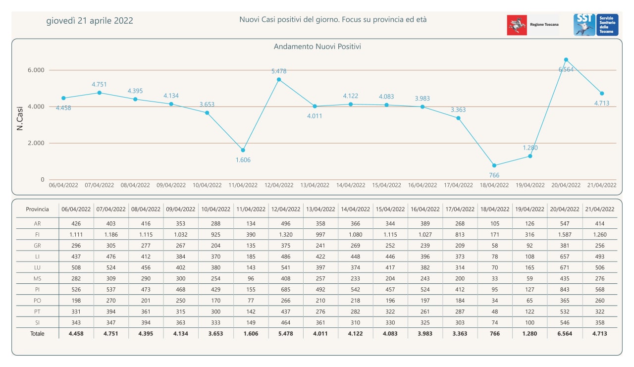 Pubblicati i dati di oggi dal Governatore. Giani. In Toscana sono 4.713 nuovi positivi al covid-19. Nel pisano sono 568 i nuovi casi