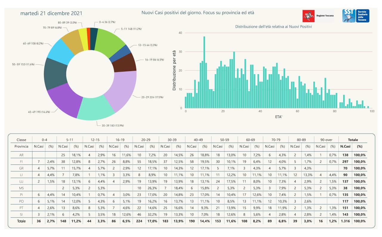 Pubblicati i dati di oggi, 21 dicembre, in Regione Toscana. Sono 1316 i nuovi casi positivi in Toscana nelle ultime 24 ore. Sono 135 i nuovi casi in provincia di Pisa