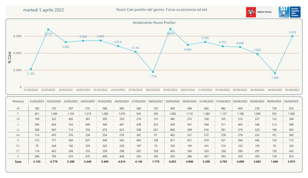 Pubblicati i dati di oggi dal Governatore. Giani. In Toscana sono 5.975 nuovi positivi al covid-19. Nel pisano sono 712 i nuovi casi