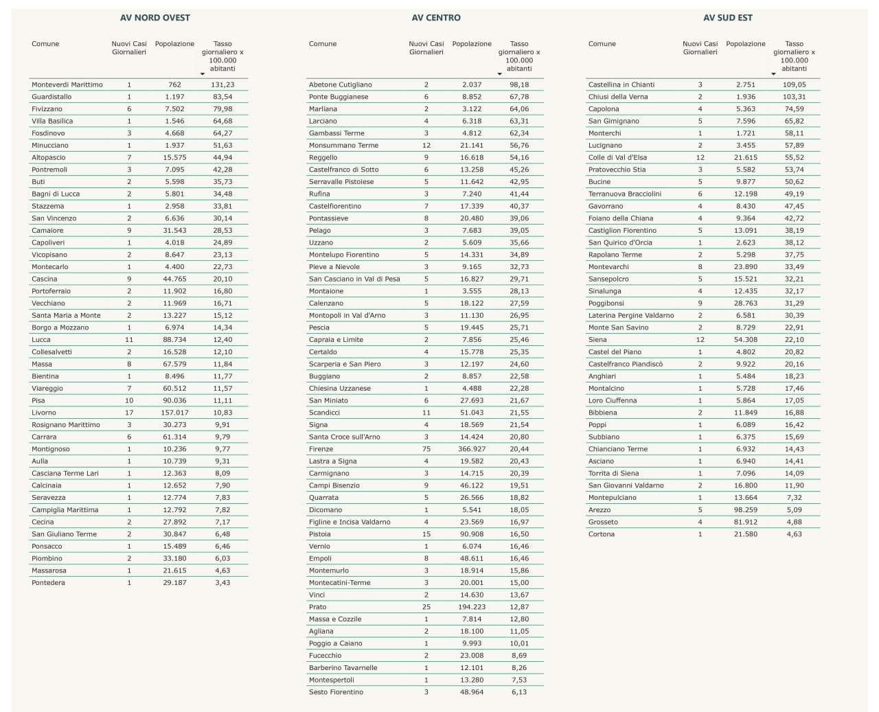 I nuovi casi registrati in Toscana sono 570 su 9.550 test di cui 7.489 tamponi molecolari e 2.061 test rapidi. Il tasso dei nuovi positivi è 5,97% (15,7% sulle prime diagnosi).
