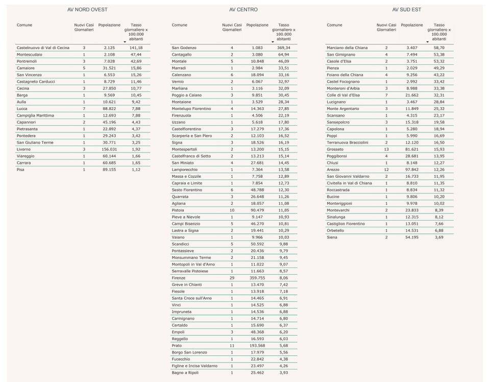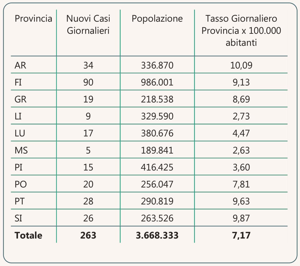 “I nuovi casi registrati in Toscana sono 263 su 16.548 test di cui 10.273 tamponi molecolari e 6.275 test rapidi. Il tasso dei nuovi positivi è 1,59% (4,2% sulle prime diagnosi).