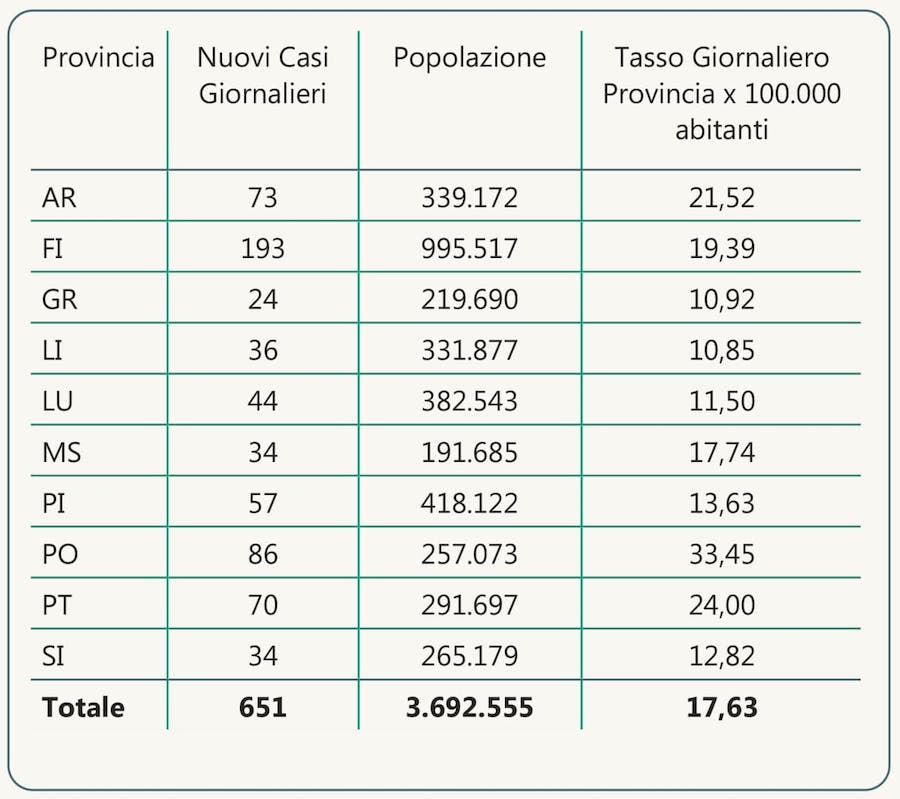 “I nuovi casi registrati in Toscana sono 651 su 23.271 test di cui 12.942 tamponi molecolari e 10.329 test rapidi. Il tasso dei nuovi positivi è 2,80% (7,7% sulle prime diagnosi).“