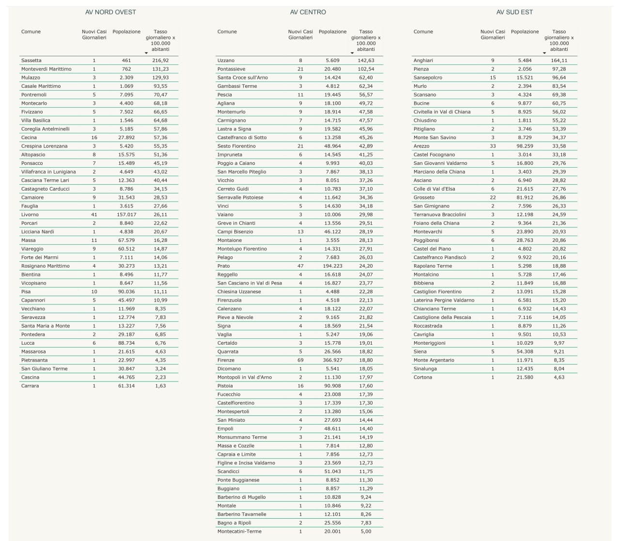 ” I nuovi casi registrati in Toscana sono 713 su 20.981 test di cui 13.500 tamponi molecolari e 7.481 test rapidi. Il tasso dei nuovi positivi è 3,40% (9,6% sulle prime diagnosi).“
