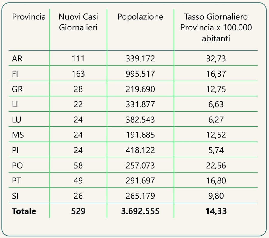 “I nuovi casi registrati in Toscana sono 529 su 23.293 test di cui 11.444 tamponi molecolari e 11.849 test rapidi. Il tasso dei nuovi positivi è 2,27% (6,7% sulle prime diagnosi).“