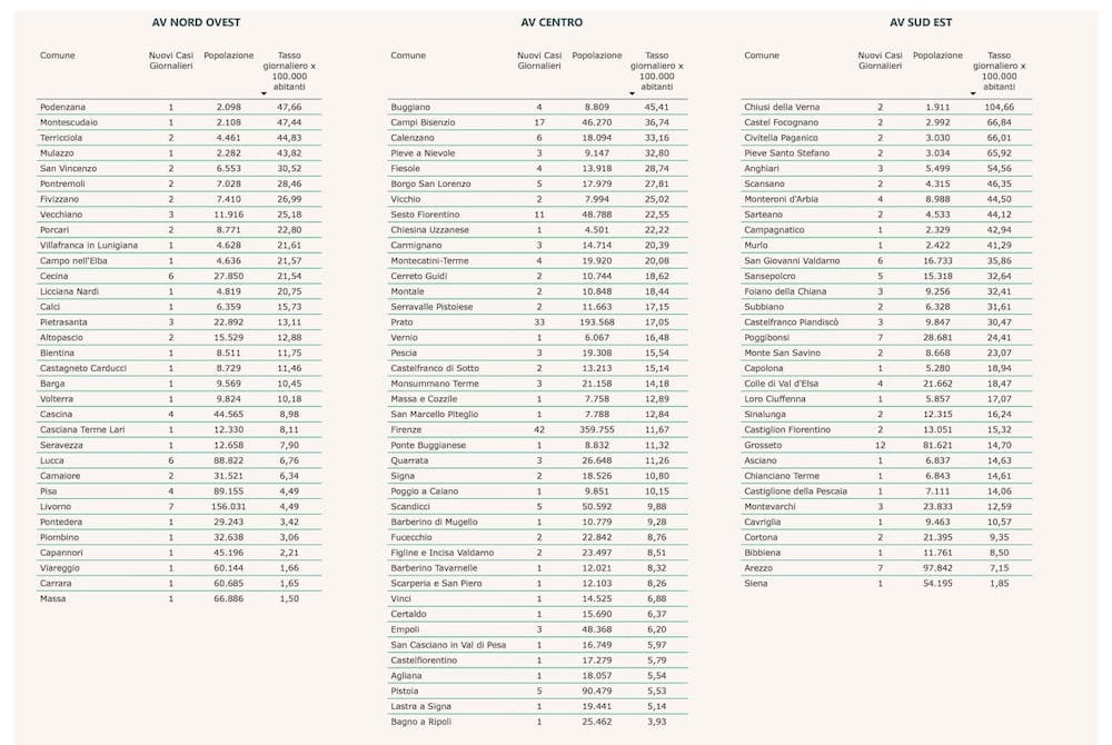“I nuovi casi registrati in Toscana sono 341 su 21.555 test di cui 11.593 tamponi molecolari e 9.962 test rapidi. Il tasso dei nuovi positivi è 1,58% (5,2% sulle prime diagnosi).