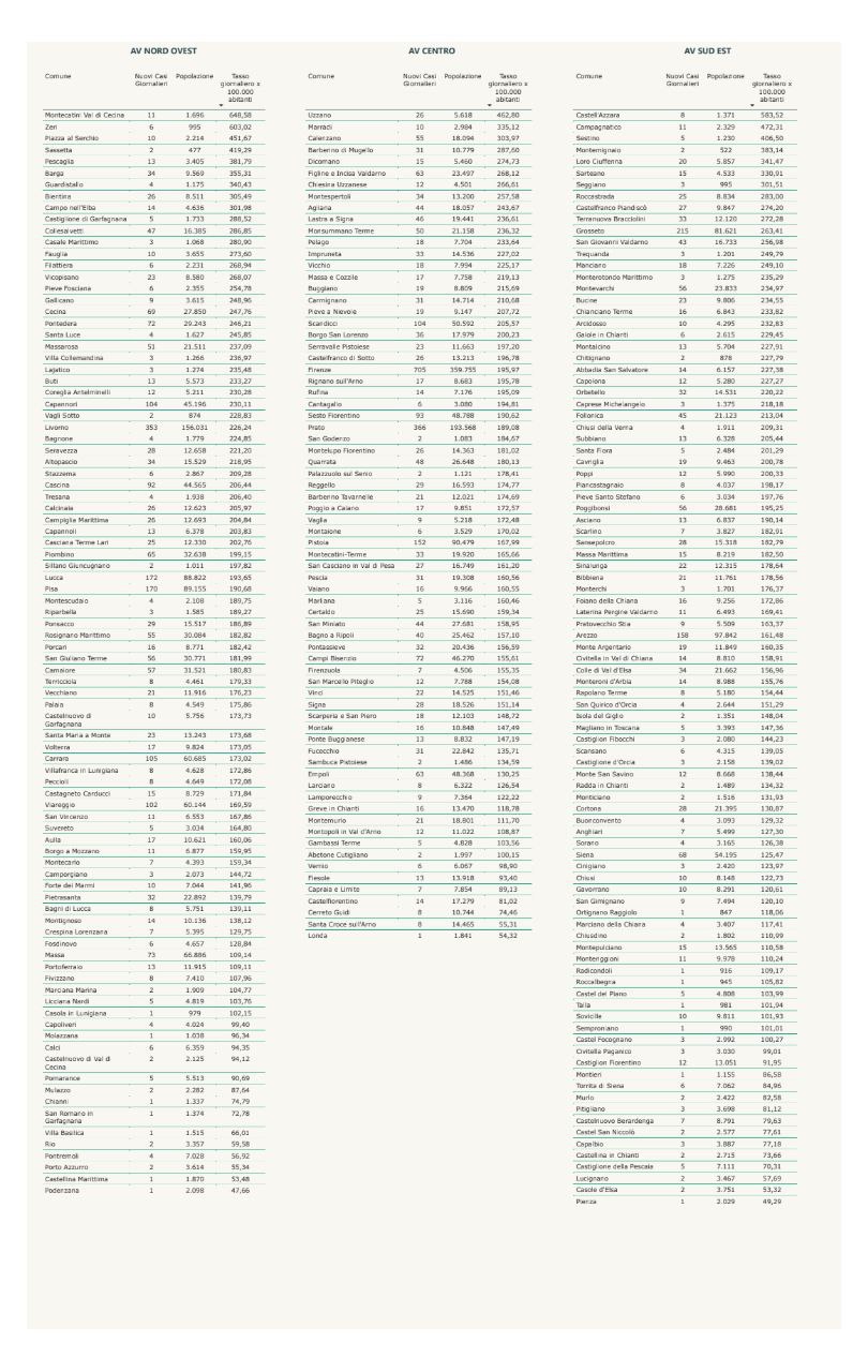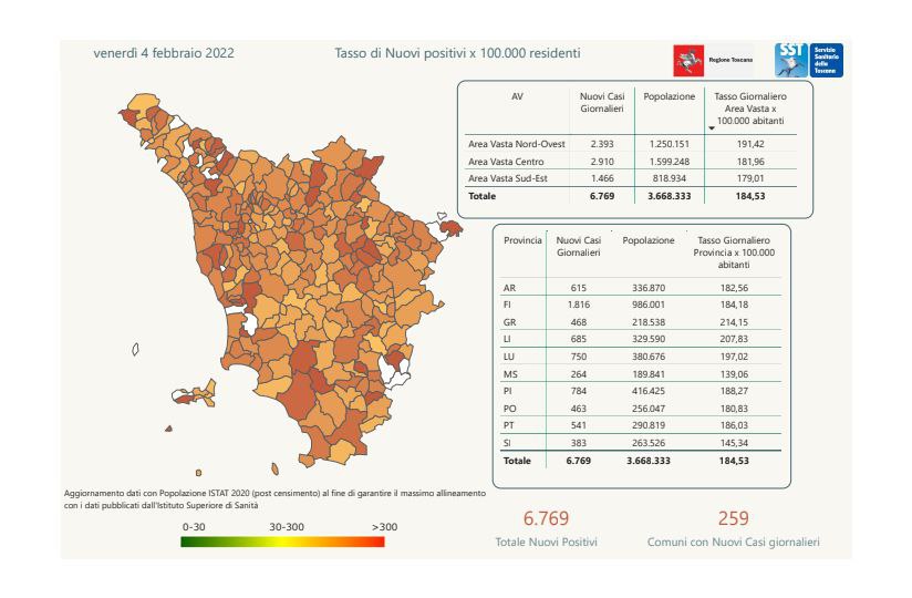 “I nuovi casi registrati in Toscana sono 6.769 su 57.534 test di cui 15.962 tamponi molecolari e 41.572 test rapidi. Il tasso dei nuovi positivi è 11,77% (69,0% sulle prime diagnosi).