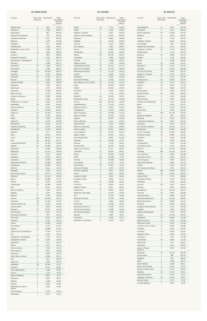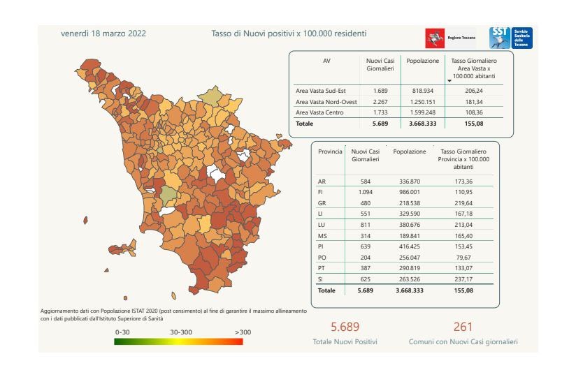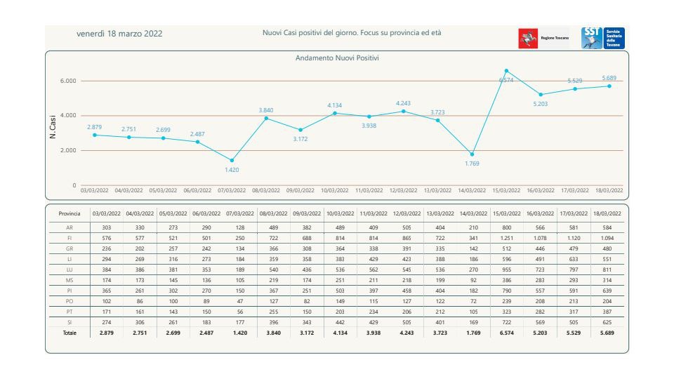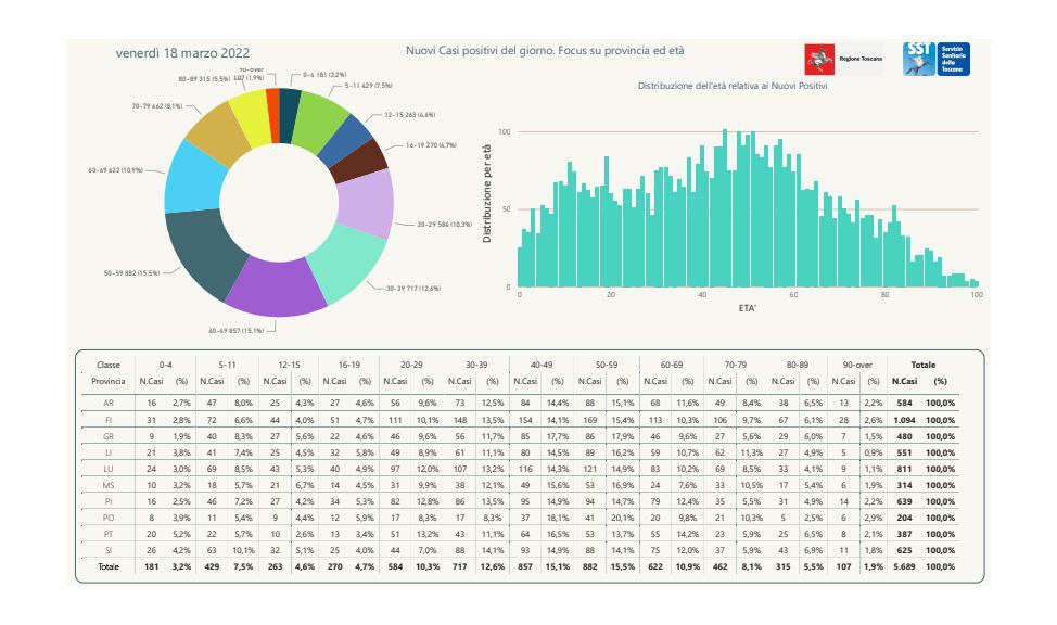 “I nuovi casi registrati in Toscana sono 5.689 su 32.596 test di cui 8.261 tamponi molecolari e 24.335 test rapidi. Il tasso dei nuovi positivi è 17,45% (63,7% sulle prime diagnosi).