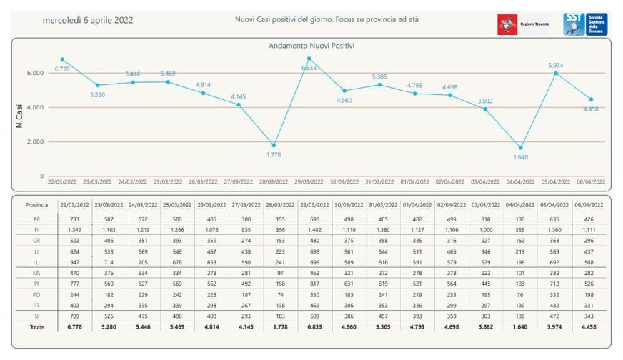 Pubblicati i dati di oggi dal Governatore. Giani. In Toscana sono 4.458 nuovi positivi al covid-19. Nel pisano sono 526 i nuovi casi