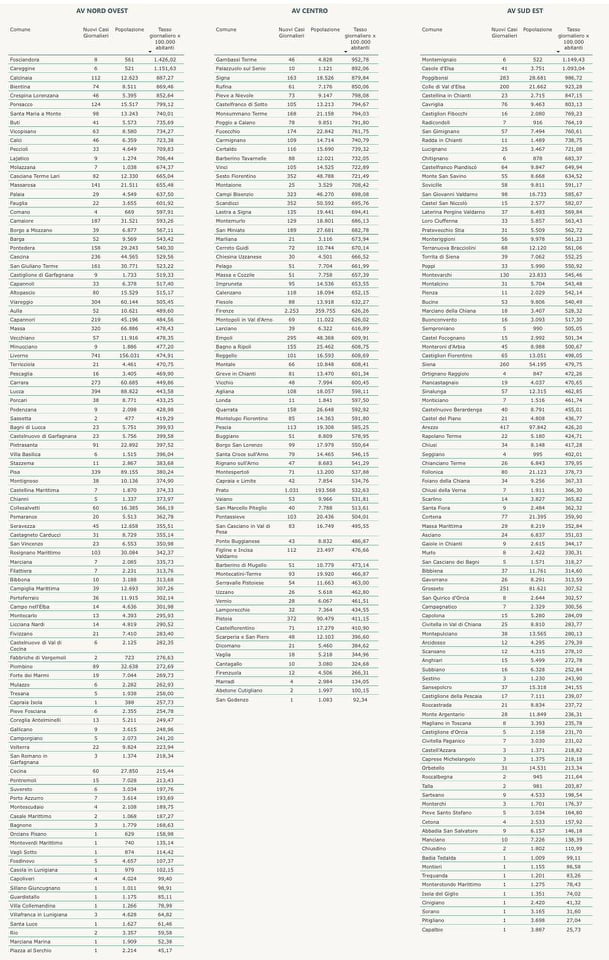I comuni sono ordinati in base al tasso di nuovi positivi ogni 100mila abitanti.