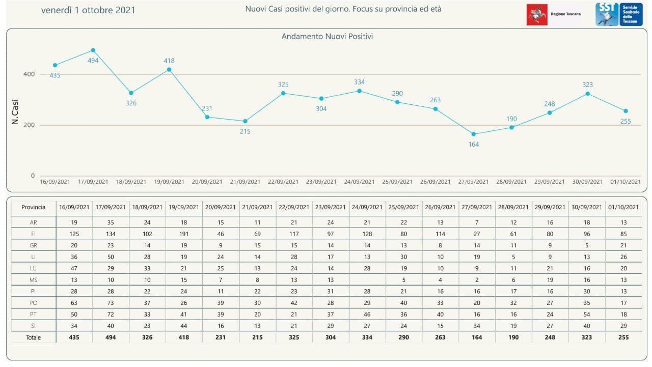 Covid: i casi di oggi 1 ottobre in Toscana con la tabella dell’andamento nelle province