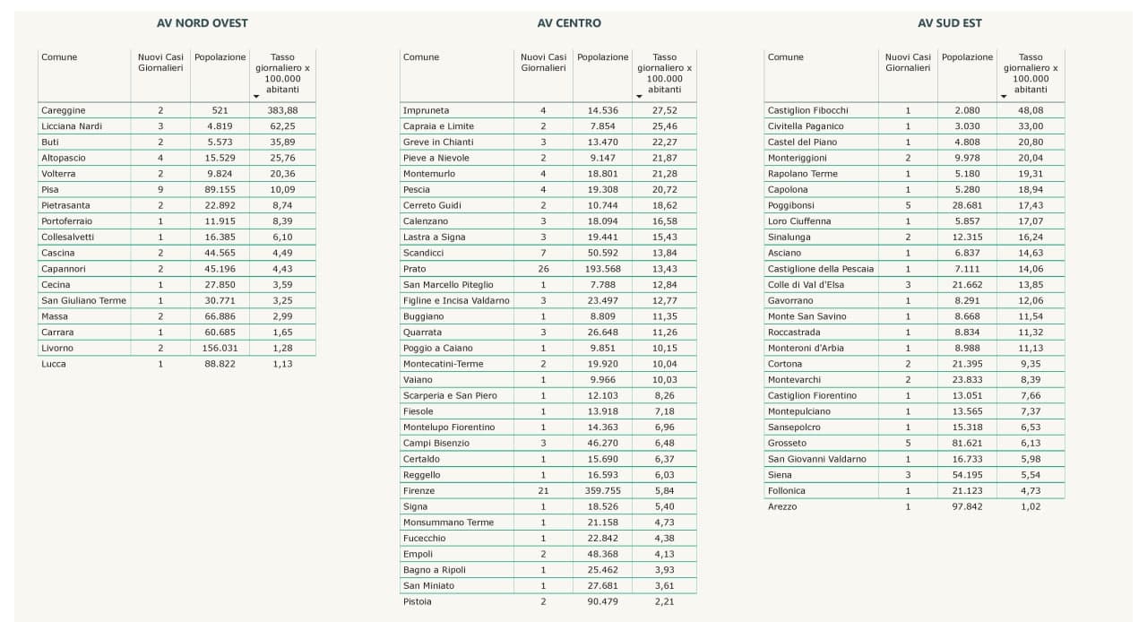 “I nuovi casi registrati in Toscana sono 190 su 19.554 test di cui 7.597 tamponi molecolari e 11.957 test rapidi. Il tasso dei nuovi positivi è 0,97% (3,0% sulle prime diagnosi).