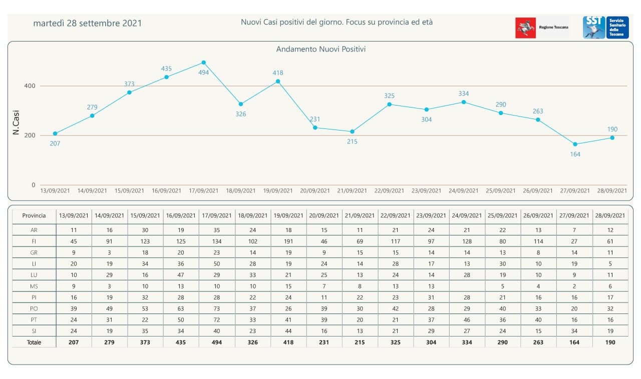 Anticipati i dati di oggi 28 settembre in Regione Toscana dal governatore Giani. Sono 190 i nuovi casi positivi in Toscana nelle ultime 24 ore