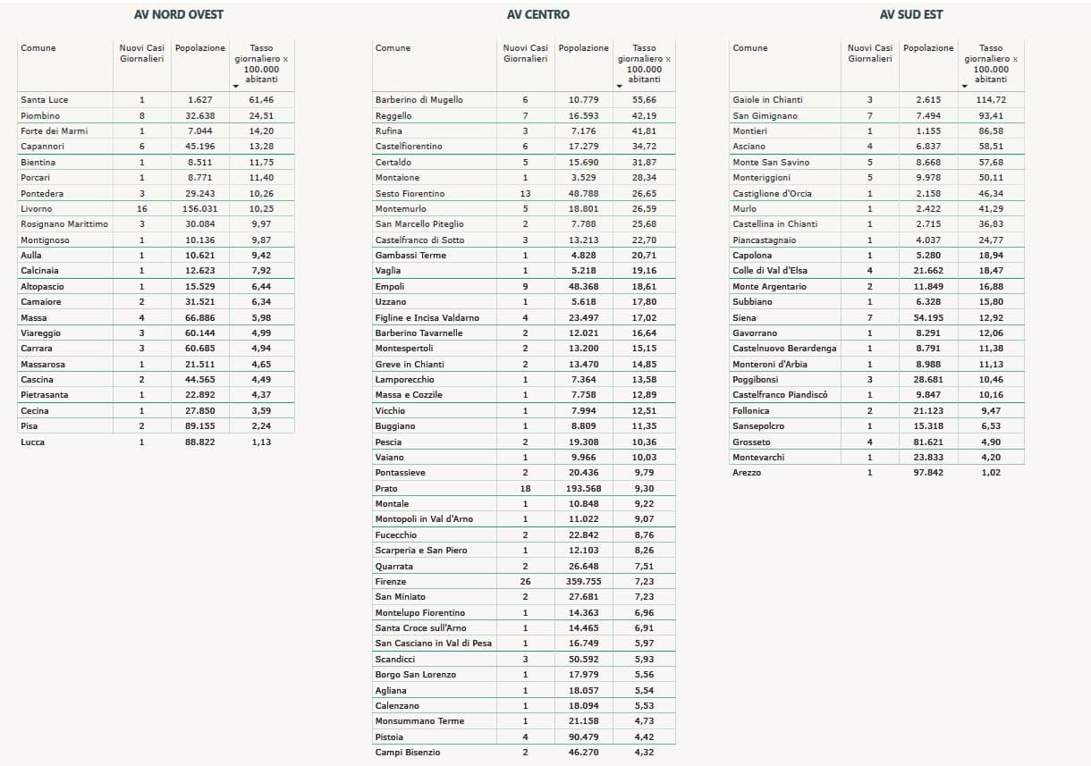 “I nuovi casi registrati in Toscana sono 275 su 17.515 test di cui 8.108 tamponi molecolari e 9.407 test rapidi. Il tasso dei nuovi positivi è 1,57% (3,7% sulle prime diagnosi). Nel grafico in basso è possibile notare che la provincia di Pisa ha un tasso giornaliero di 4,08 casi ogni 100.000 abitanti, seconda solo alla provincia di Arezzo, e notevolmente sotto la media regionale (7,50)
