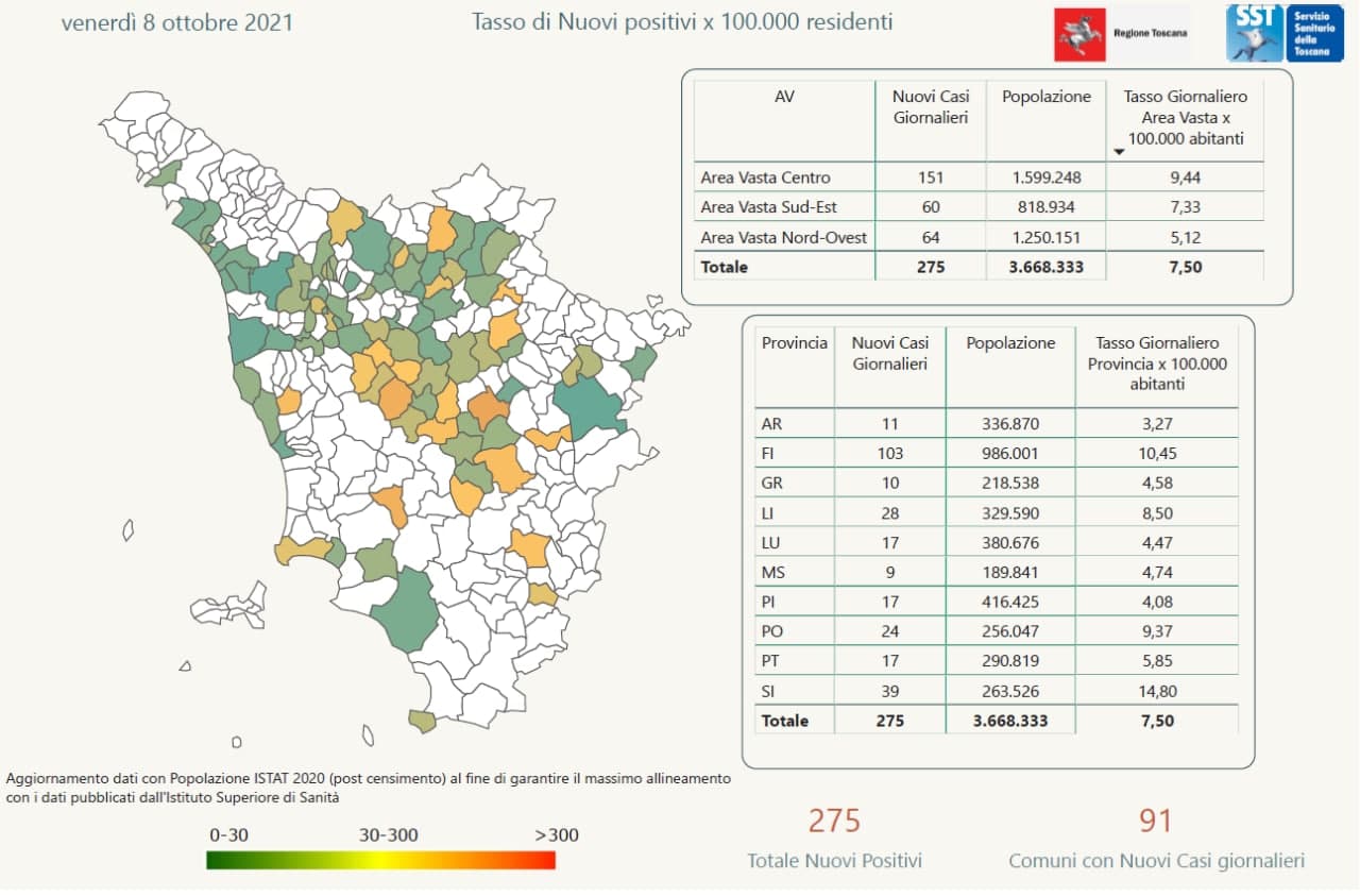 Anticipati i dati di oggi 8 ottobre in Regione Toscana dal governatore Giani. Sono 275 i nuovi casi positivi in Toscana nelle ultime 24 ore