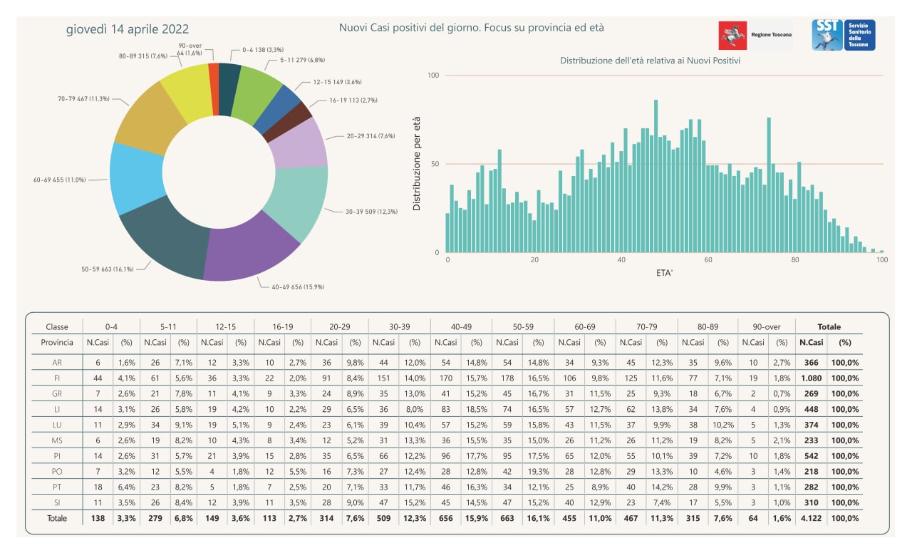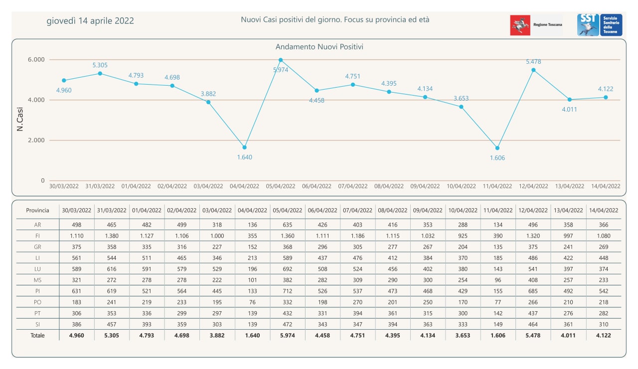 Pubblicati i dati di oggi dal Governatore. Giani. In Toscana sono 4.122 nuovi positivi al covid-19. Nel pisano sono 542 i nuovi casi