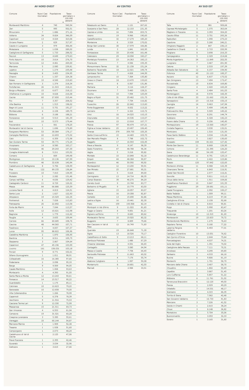 I dati suddivisi per comune: