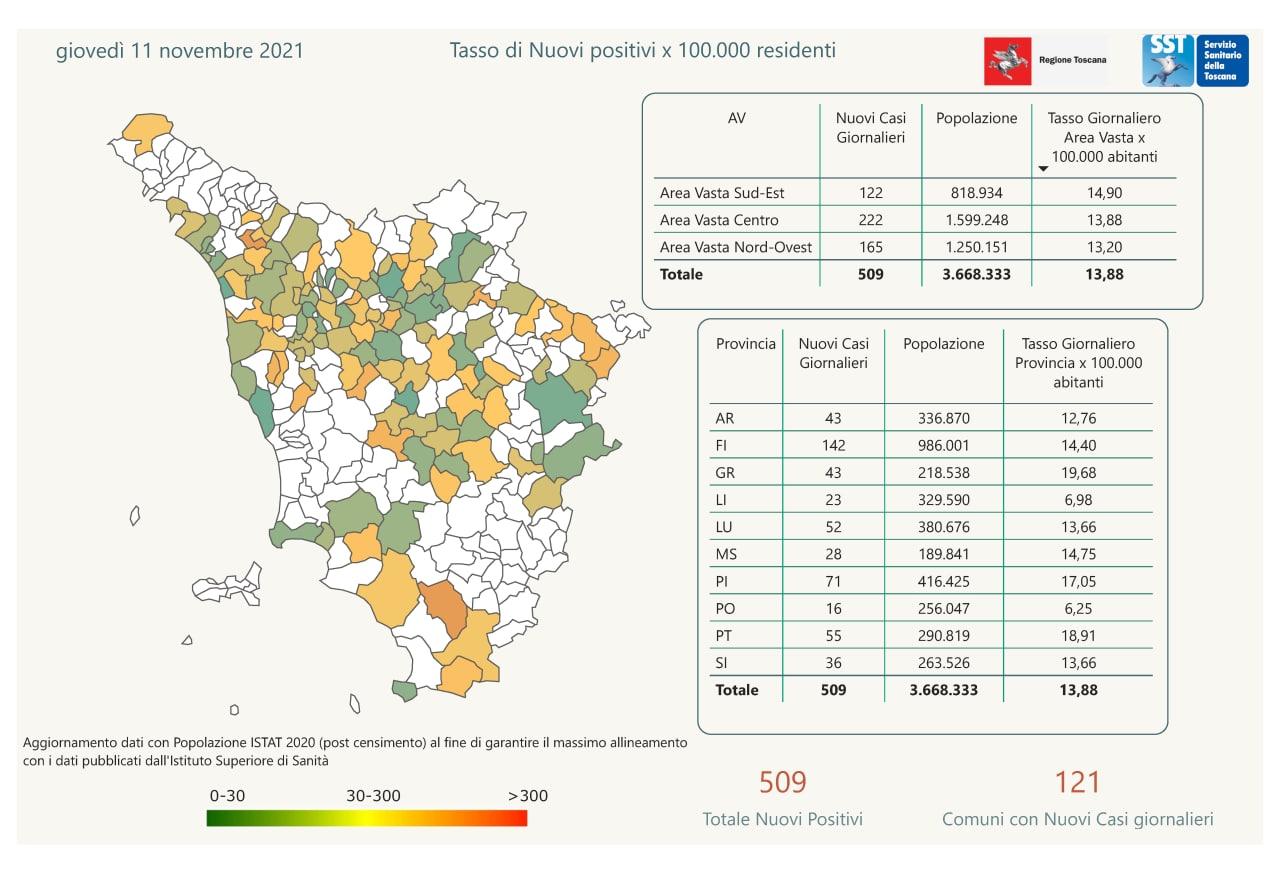 Pubblicati i dati di oggi, 11 novembre, in Regione Toscana. Sono 509 i nuovi casi positivi in Toscana nelle ultime 24 ore