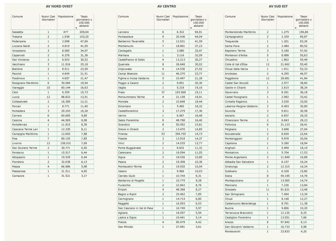 “I nuovi casi registrati in Toscana sono 431 su 17.607 test di cui 8.631 tamponi molecolari e 8.976 test rapidi. Il tasso dei nuovi positivi è 2,45% (7,5% sulle prime diagnosi).
