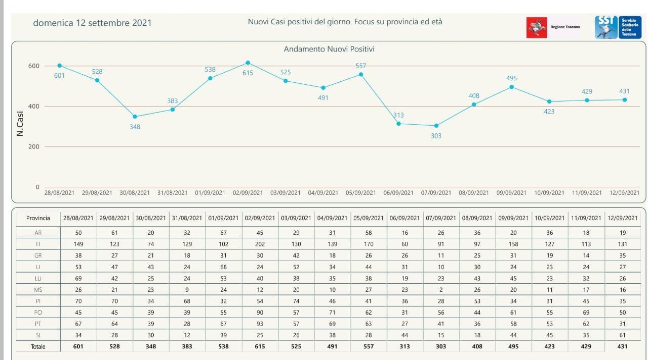 Anticipati i dati di oggi 12 settembre in Regione Toscana dal governatore Giani. Sono 431 i nuovi casi positivi in Toscana nelle ultime 24 ore