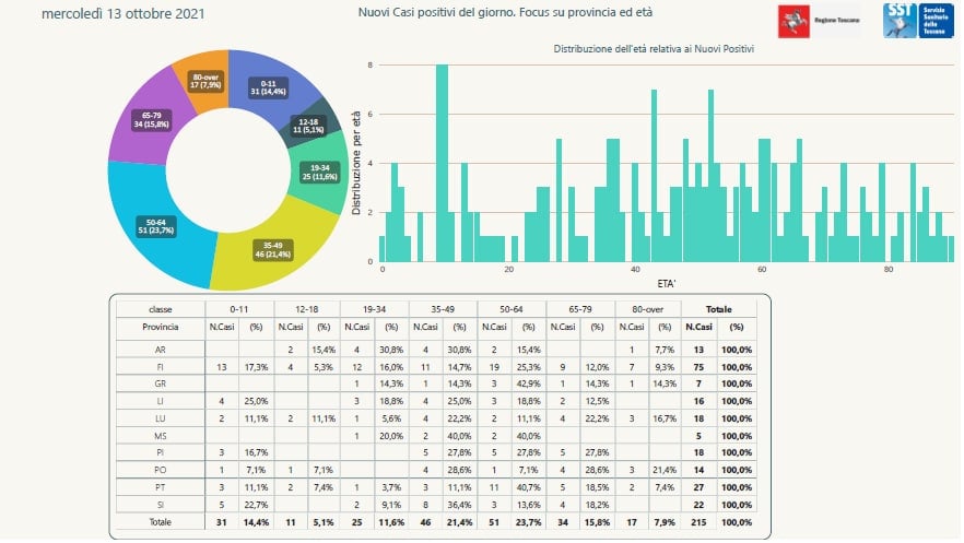 Anticipati i dati di oggi 13 ottobre in Regione Toscana dal governatore Giani. Sono 215 i nuovi casi positivi in Toscana nelle ultime 24 ore