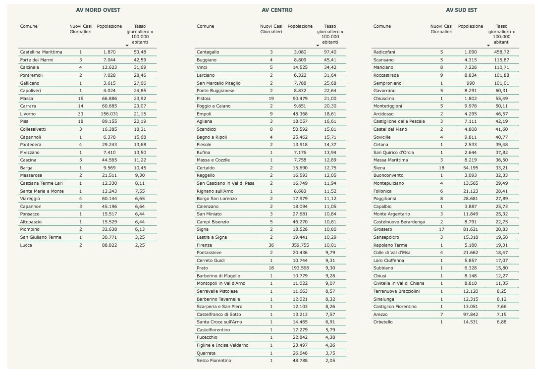 “I nuovi casi registrati in Toscana sono 423 su 31.583 test di cui 9.003 tamponi molecolari e 22.580 test rapidi. Il tasso dei nuovi positivi è 1,34% (5,0% sulle prime diagnosi).