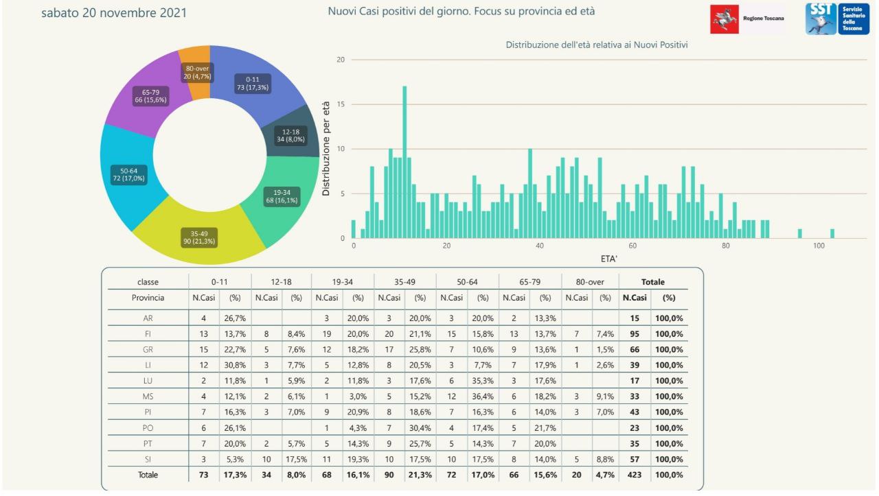 Pubblicati i dati di oggi, 20 novembre, in Regione Toscana. Sono 423 i nuovi casi positivi in Toscana nelle ultime 24 ore