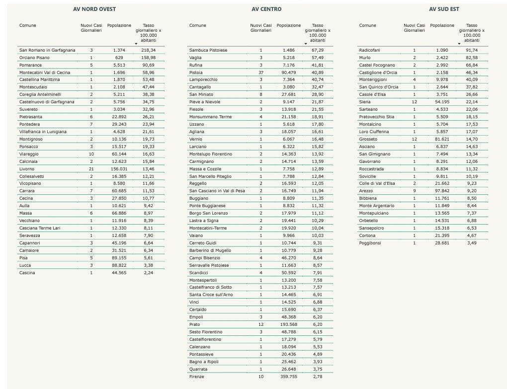 “I nuovi casi registrati in Toscana sono 308 su 13.084 test di cui 5.315 tamponi molecolari e 7.769 test rapidi. Il tasso dei nuovi positivi è 2,35% (7,1% sulle prime diagnosi).
