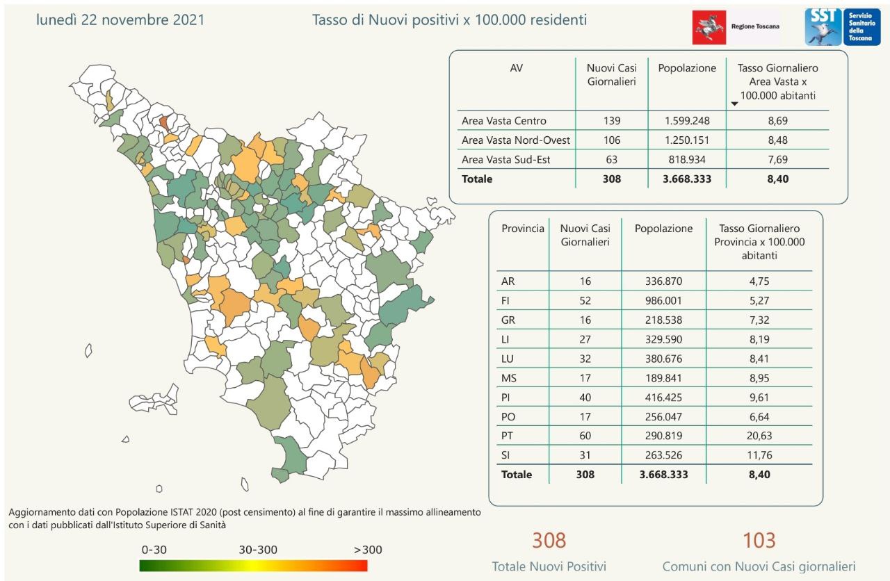 Pubblicati i dati di oggi, 22 novembre, in Regione Toscana. Sono 308 i nuovi casi positivi in Toscana nelle ultime 24 ore