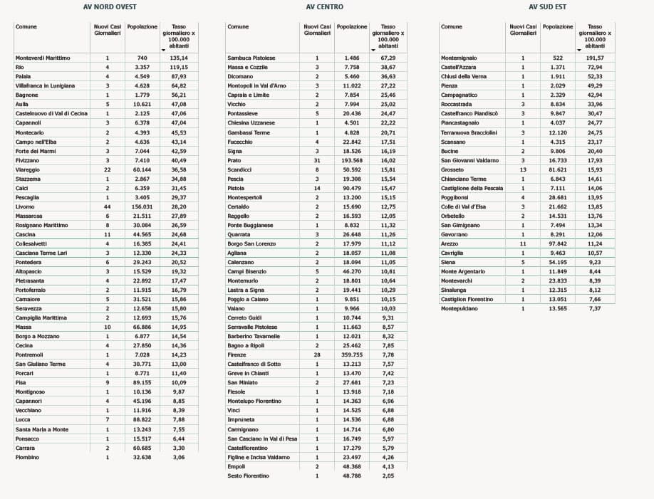“I nuovi casi registrati in Toscana sono 434 su 6.583 test di cui 5.258 tamponi molecolari e 1.325 test rapidi. Il tasso dei nuovi positivi è 6,59% (14,5% sulle prime diagnosi).“