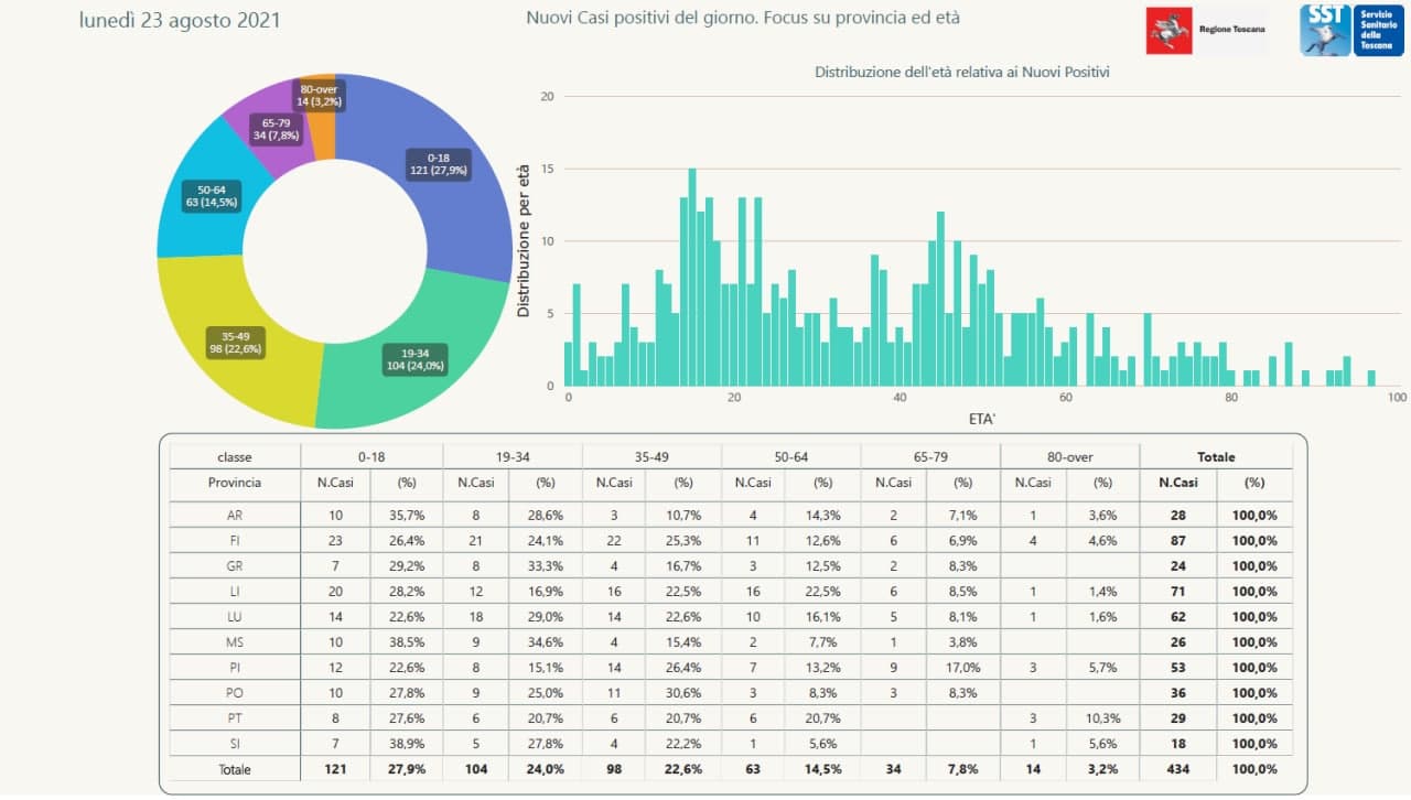 Anticipati i dati di oggi 23 agosto in Regione Toscana dal governatore Giani. Sono 434 i nuovi casi positivi in Toscana nelle ultime 24 ore