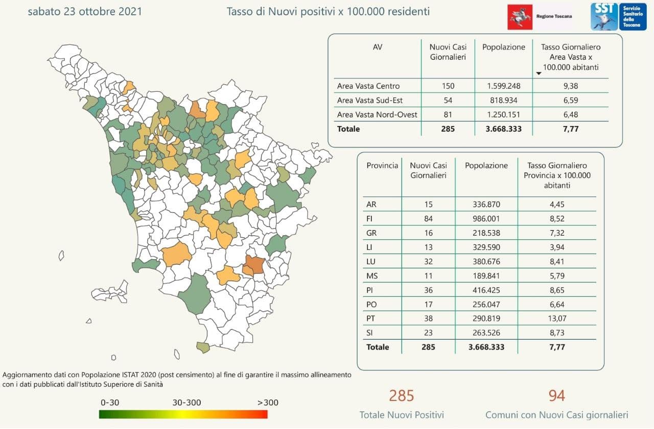 Pubblicati i dati di oggi 23 ottobre in Regione Toscana. Sono 285 i nuovi casi positivi in Toscana nelle ultime 24 ore