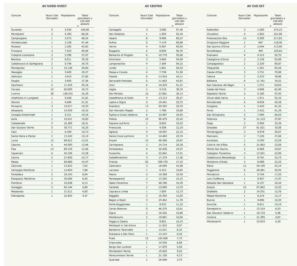 “I nuovi casi registrati in Toscana sono 610 su 35.129 test di cui 10.443 tamponi molecolari e 24.686 test rapidi. Il tasso dei nuovi positivi è 1,74% (5,9% sulle prime diagnosi).