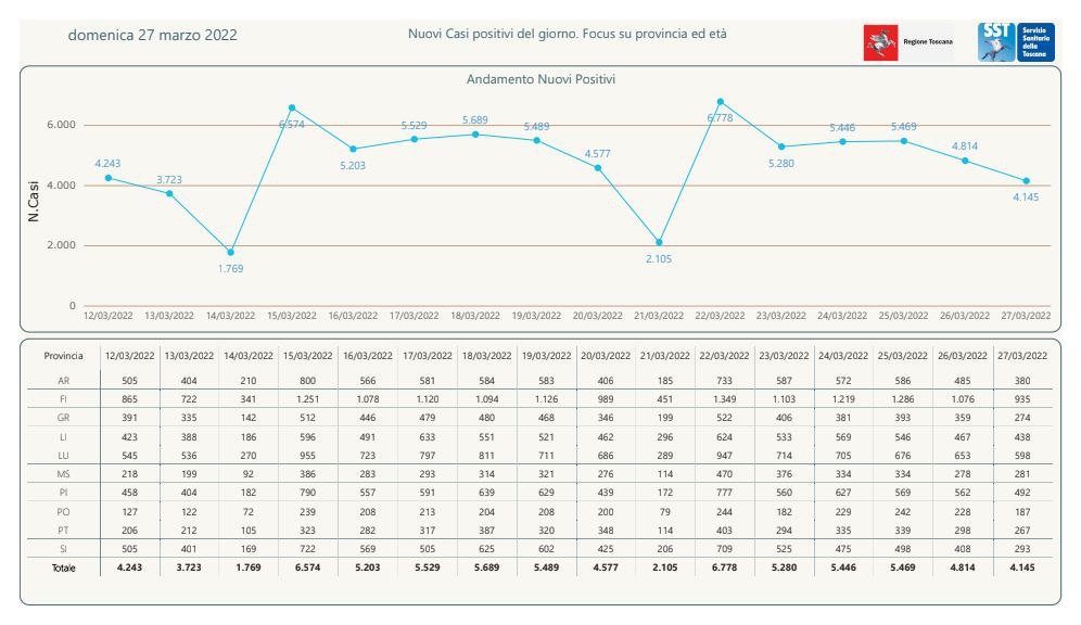“I nuovi casi registrati in Toscana sono 4.145 su 28.279 test di cui 8.192 tamponi molecolari e 20.087 test rapidi. Il tasso dei nuovi positivi è 14,66% (54,0% sulle prime diagnosi).
