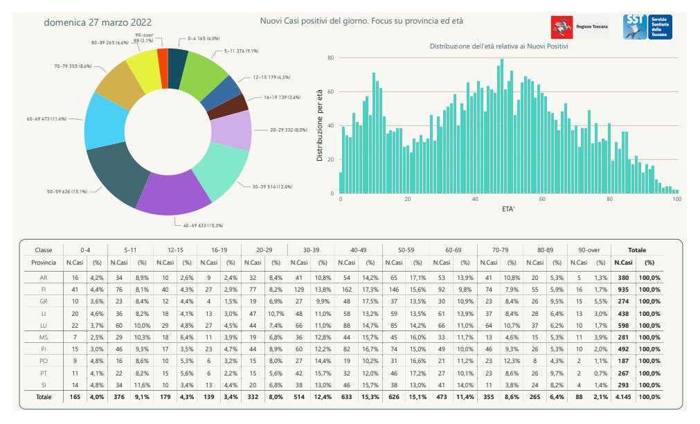 “I nuovi casi registrati in Toscana sono 4.145 su 28.279 test di cui 8.192 tamponi molecolari e 20.087 test rapidi. Il tasso dei nuovi positivi è 14,66% (54,0% sulle prime diagnosi).