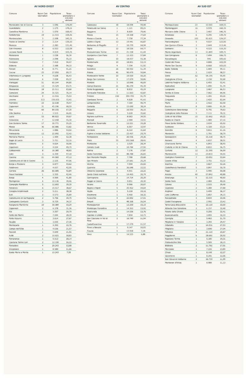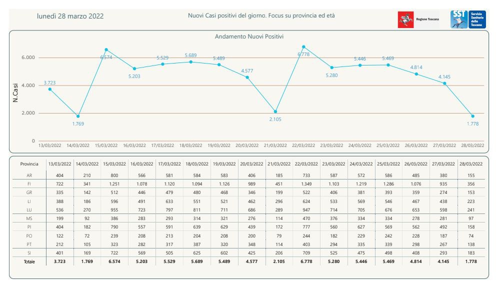 “I nuovi casi registrati in Toscana sono 1.778 su 11.563 test di cui 4.523 tamponi molecolari e 7.040 test rapidi. Il tasso dei nuovi positivi è 15,38% (48,7% sulle prime diagnosi).