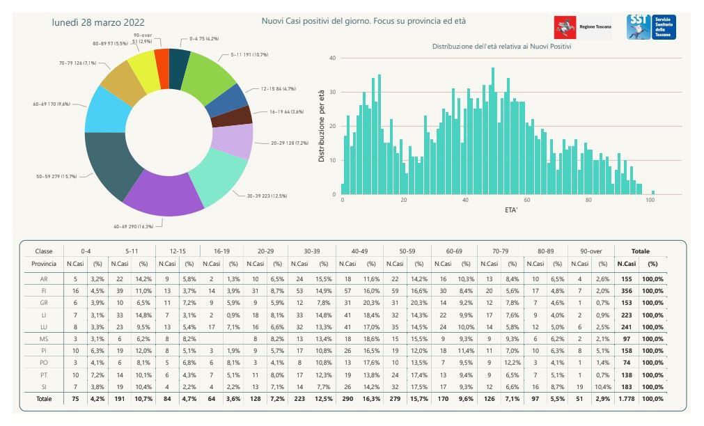 “I nuovi casi registrati in Toscana sono 1.778 su 11.563 test di cui 4.523 tamponi molecolari e 7.040 test rapidi. Il tasso dei nuovi positivi è 15,38% (48,7% sulle prime diagnosi).