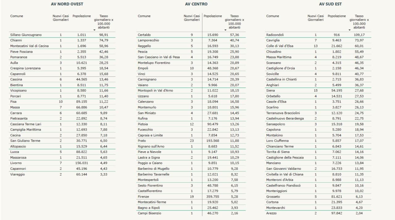 “I nuovi casi registrati in Toscana sono 290 su 37.543 test di cui 8.740 tamponi molecolari e 28.803 test rapidi. Il tasso dei nuovi positivi è 0,77% (3,0% sulle prime diagnosi).